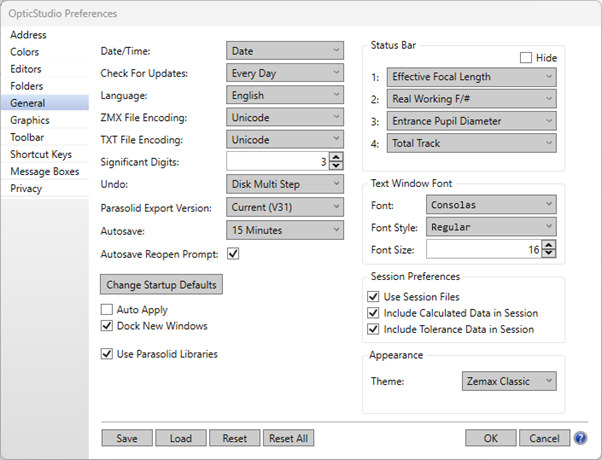 全般的な設定は、[設定] (Setup) タブの [システム] (System) セクションにあるボタンを使用して表示される [OpticStudio 環境設定] (OpticStudio Preferences) ウィンドウで設定できます。