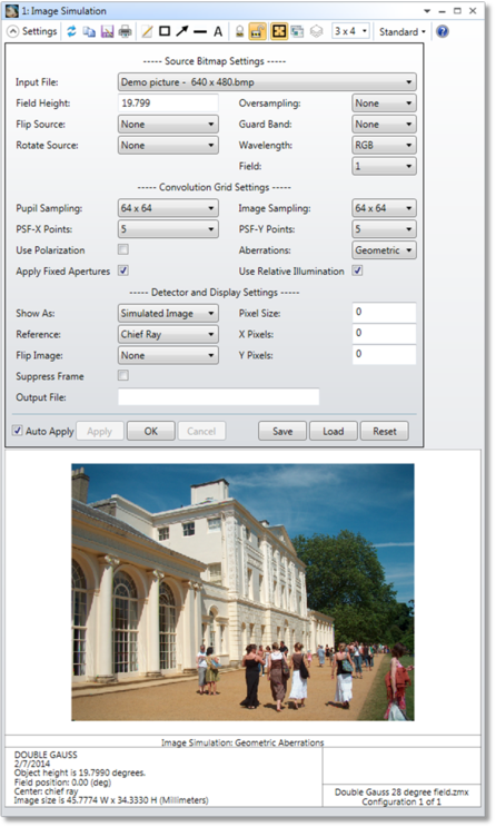 この機能は、点強度分布関数の配列で光源のビットマップ ファイルをコンボリューション処理することにより、像の形成をシミュレーションします。回折、収差、ディストーション、周辺光量比、像の方向、偏光などによる効果が考慮されます。
