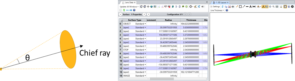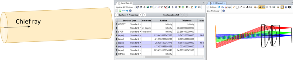 Ansys Zemax OpticStudio の各視野の光線は、点光源と絞りアパチャーの相対位置によって定義され、楕円形の断面を持つ非対称のビームの広がりが生じる可能性があります。Speos では、ビームの広がりは対称で円形の断面を持ち、半径は楕円形断面の軌道長半径に相当します。
