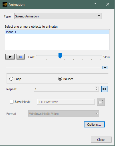 Right-click Plane 1 in the 3D Viewer and select Animate. The Animation dialog box appears and the plane moves through the entire domain.