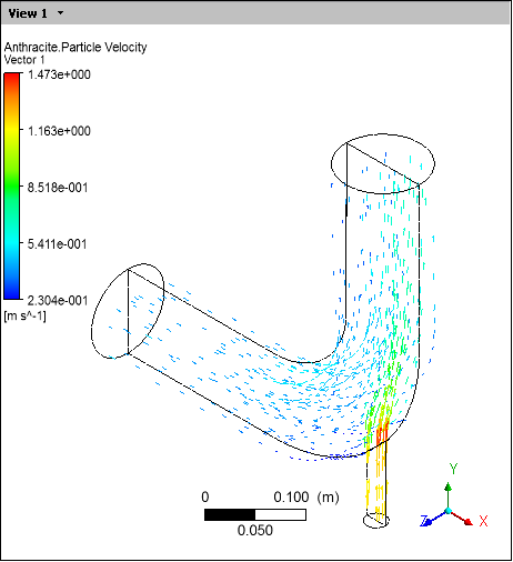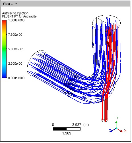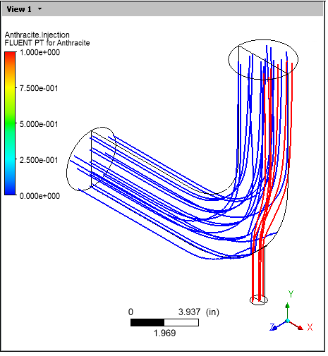 After viewing the vector plot, clear User locations and Plots > Vector 2 and select User locations and Plots > Fluent PT for Anthracite in order to view the particle tracks only.