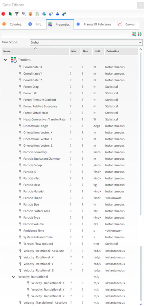 The Data Editors panel shows the settings and parameters available for the item selected in the Data panel (see also About the Data Panel). Figure 1 shows the Data Editors panel view when Particles is chosen in the Data panel.