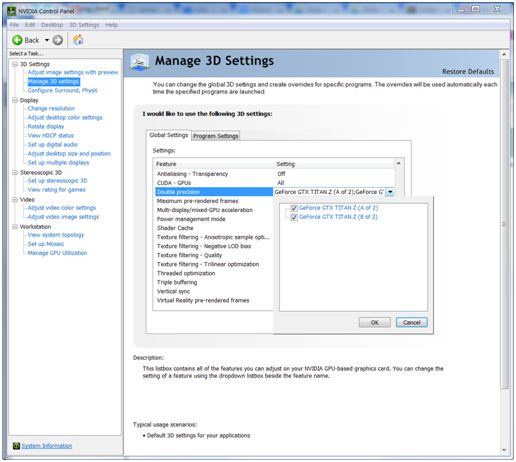 In the Global Settings tab under Feature, select Double precision and then from the drop-down list, ensure all your Titan GPU cards are enabled (checked) (Figure 8).