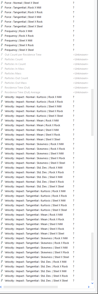 Rocky calculates Properties for individual geometry components, including conveyors and imported geometries; Particles, Contacts, 1-Way LBM, 1-Way Fluent, 2-Way Fluent, Eulerian Statistics, various kinds of Collision Statistics, and individual User Processes based upon these entities.
