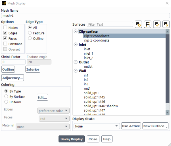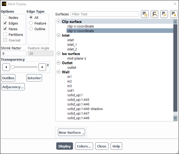 In the Mesh Display dialog box, deselect all surfaces, select the clip-z-coordinate surface, click Display and close the dialog.
