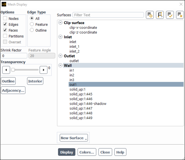 In the Mesh Display dialog box, deselect all surfaces, select the out1 surface, click Display and close the dialog.