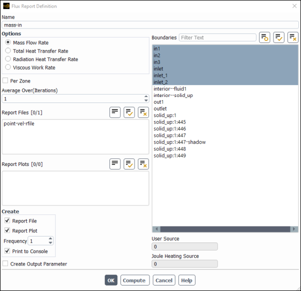 The new surface report definition mass-in will appear under the Solution/Report Definitions tree item. Ansys Fluent also automatically creates the following items:
