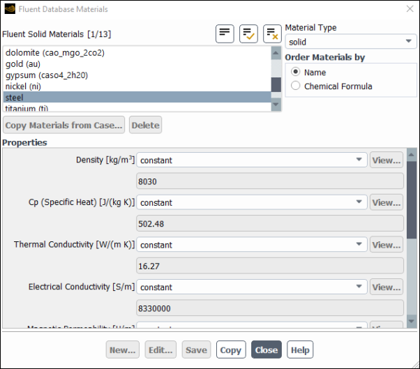 Add steel to the list of solid materials by copying it from the Ansys Fluent materials database.