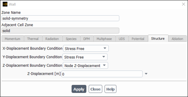 Set the boundary conditions for all of the wall zones of the solid cell zone that lie on the plane of symmetry and represent the center of the probe. In this case there are two: they should be free to move with no stress in the X- and Y-directions, but fixed in the Z-direction.