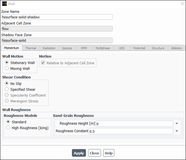 Note that the Adjacent Cell Zone for this wall is flow, which is the fluid zone. The side of the wall / wall-shadow pair that is immediately adjacent to the fluid does not require any settings in the Structure tab, and so this tab is not available.