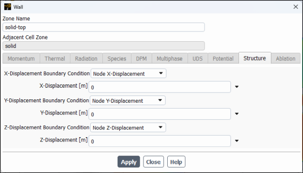 Note that the Adjacent Cell Zone for this wall is solid, which is the solid zone. The side of the wall / wall-shadow pair that is immediately adjacent to the solid does require structural settings (that is, displacement boundary conditions).