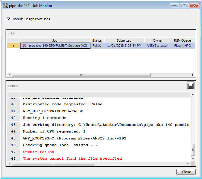 If a job fails, click on the job in the Job Monitor. The RSM job log is displayed in the monitor's lower pane: