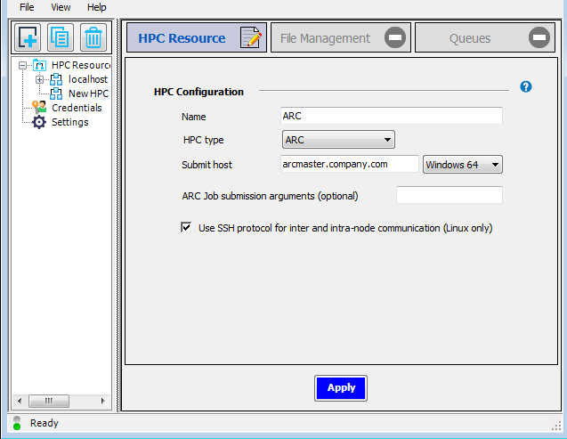 .On the HPC Resource tab, specify a Name for the configuration, set the HPC type to , and specify the domain name of the cluster Submit host. For this tutorial we will assume that the cluster is running on Windows, so ensure that Windows 64 is selected in the adjacent drop-down: