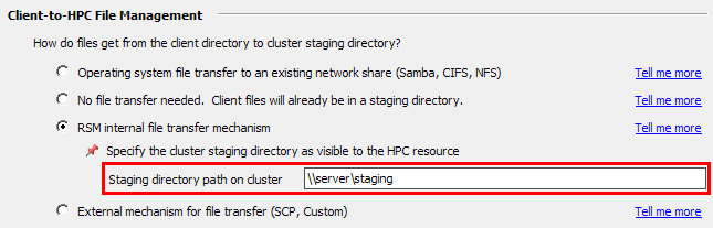 Select the File Management tab. For this example we are assuming that the remote cluster staging directory is not visible to client machines. In the Client-to-HPC File Management section, select RSM internal file transfer mechanism, then specify the path to the directory where job files will be staged (as the cluster sees it):
