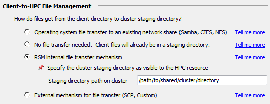If a client cannot “see” the Linux cluster staging area, select RSM internal file transfer mechanism, then specify the path to the staging area in the Staging directory path on cluster field (for example,