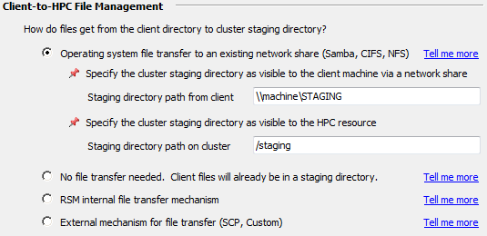 If a client can “see” the Linux cluster staging area via a network share, Samba share, or mapped drive, select Operating system file system transfer to existing network share (Samba, CIFS, NFS). With this option, RSM will (attempt to) copy jobs to and from the cluster staging directory using native OS “copy” commands.