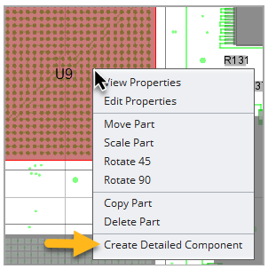 From the Layer Viewer, select Edit Components from the Edit menu. Right-click the BGA component of interest and in the context menu select Created Detailed Component. Sherlock will ask for confirmation before creating the detailed component. In the image below, BGA component U9 has been selected.