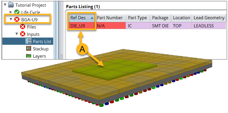 To represent the die of the new detailed model, Sherlock creates a part centered on the new CCA (A, below). The name of this part will be Die_<RefDes>. As an example, for BGA U9, the name of the part will be DIE_U9. The Part Type will be IC.