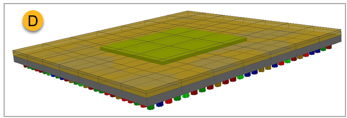The new Detailed Component appears in the Project Tree as a CCA (A, in the image below). For details on the CCA's properties, see CCA Properties below. Image B shows how the Detailed Component appears in Sherlock's Layer Viewer. In image D, it is shown in the 3D Viewer.
