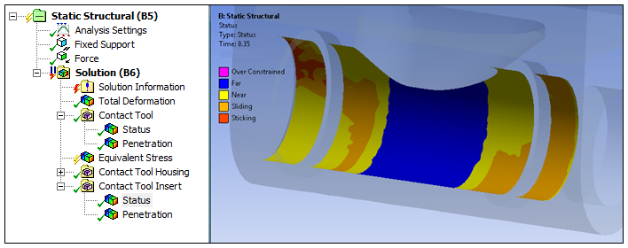 When a Solution fails to converge, you can review the results at the converged substeps, which can be invaluable for diagnosing problems. Checking the contact result Status is a useful first step. It can help you understand the global contact behavior of the model and enable you to find problem areas. An example is shown below.