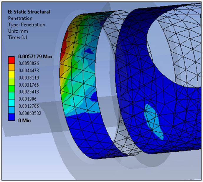 It is important to ensure that the contact penetration is small relative to local displacements. The reason is that any contact penetration is technically impossible, since bodies do not move into each other. A good check is to add the contact result to the local displacement and compute a back-of-the-envelope strain calculation. This helps determine if the penetration is significantly affecting the stress calculations. An example is shown below. Ways to reduce penetration include: