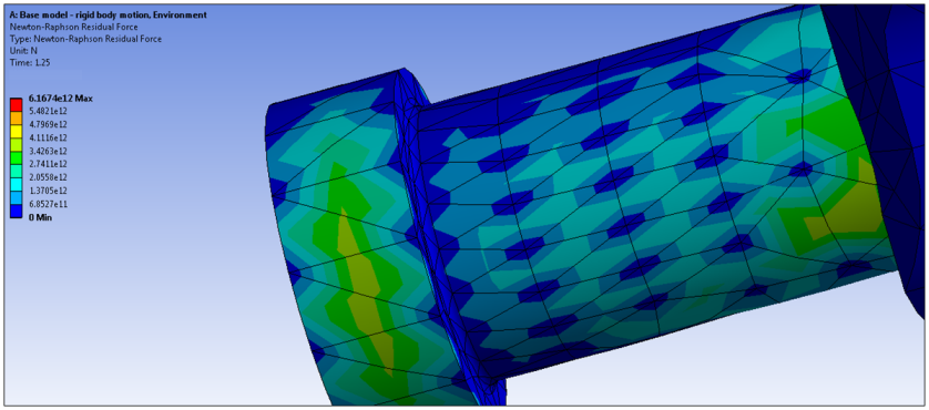 For a failed solution, requesting Newton-Raphson residuals helps to identify areas where attention is needed. It is especially useful for models with many nonlinear contacts, and the pair which caused the convergence difficulty is not known. An example is shown below.
