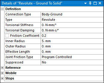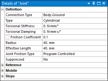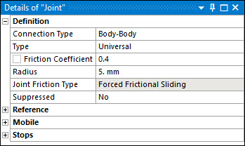 For imperfect joints, the Friction Coefficient property appears under the Stops definition group: