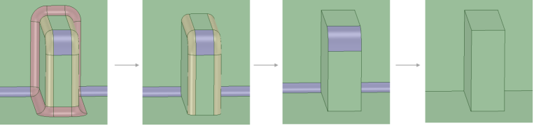 Um eine genaue und vollständige Entfernung der Rundungen sicherzustellen, die Rundungen in umgekehrter Reihenfolge der Erstellung entfernen, wie im nachfolgenden Beispiel eines Modells mit farbigen Rundungen veranschaulicht.