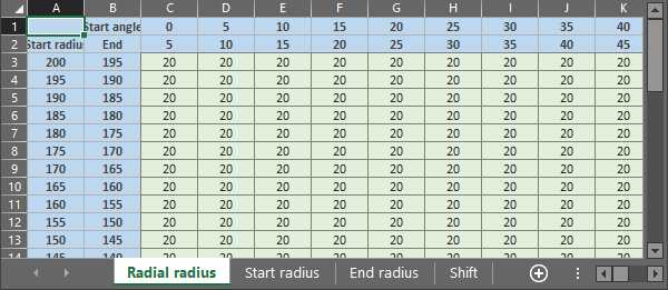 When using the Excel File definition, the radii pillows are built according to the values written in the Excel. They are not built according to a ratio of the position between the Start radius and End radius values. |