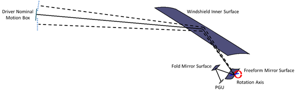 The Picture Generation Unit (PGU) displays a deformed image to the driver. This deformation comes from the propagation of the image through the HUD system.
