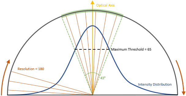 The Freeform Lens works only in refraction. However, according to the intensity distribution of the file which can display light on a half-sphere, raking rays on edges are not refracted and the Backface of the Freeform Lens cannot be designed correctly. Thus the Maximum Threshold has been introduced to overcome this issue.