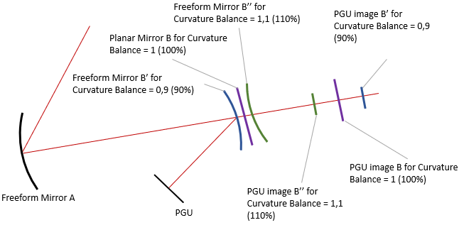 Curvature Balance pilots the curvature of the first freeform mirror to get the best image quality. If the curvature balance is left unedited (= 0), it is automatically calculated by the algorithm based on the PGU usage.