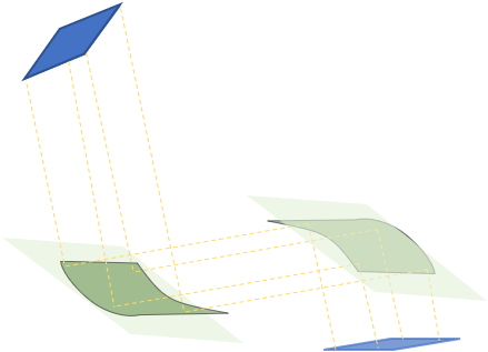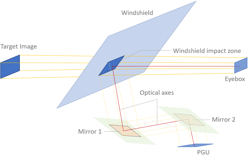 Before the optimization, mirrors are considered as planar on an infinite plane. The infinite plane is orthogonal to the bisector of the optical axes defined for the two mirrors. These planar mirrors are based on the projection of the corner’s rays made by the Target Image / Eyebox optical volume on the windshield (Windshield impact zone). Planar mirrors have a ratio equal to 1 and all rays intersect the mirrors.