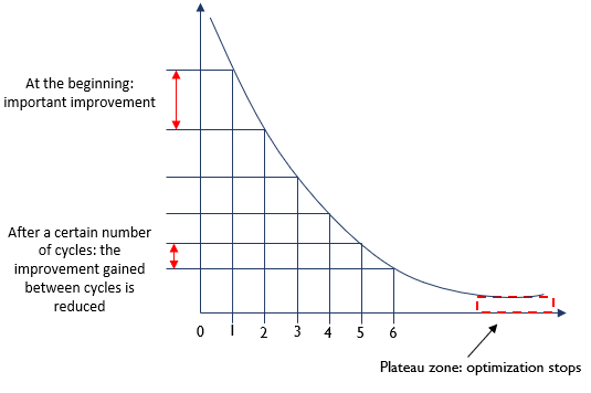 The optimization works in a principle of cycles. At each cycle, the result is optimized and the optical quality increases. After a certain number of cycles, the system becomes more and more defined and the improvement gained on a cycle is greatly reduced. When between two cycles, only 0.05% of improvement is achieved, the optimization stops.