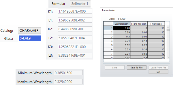 The Material corresponds to the Volume Optical Properties of the lens. Ansys Zemax OpticStudio provides an open catalog of glasses and their reference.