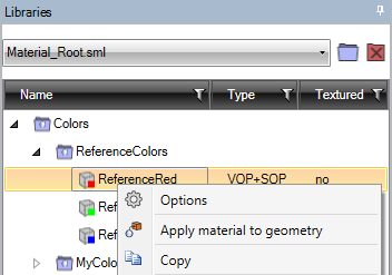 This procedure helps you apply a Volume/Surface Optical Properties material (VOP/SOP) on bodies or Face Optical Properties material (FOP) on faces from an opened material library.