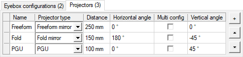 - In the Projector type column, select Freeform mirror to create a mirror used for the optimization, or Fold mirror to create a mirror used to reduce the volume of the projector