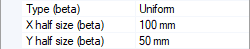 Each half size is generated from the target origin. A X half size of 100 mm means the X size of the target is 200 mm.