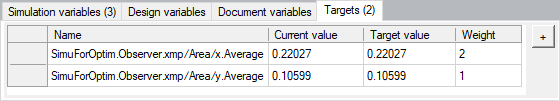 In the Targets tab, for each target, set the Target value to reach (Merit function minimize) or from which to move away (Merit function maximize) and its Weight.