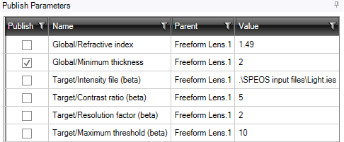 In the Publish Parameters panel, a list of the possible parameters you can use in optiSLang appears.