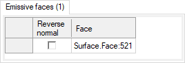 Note: The selection of faces from an imported *.obj file is not compatible with the Surface Source.The face(s) appear in the Emissive faces list. A preview of the ray's distribution and color appears in the 3D view._Source_Surface_Emissive_Faces_List.png)