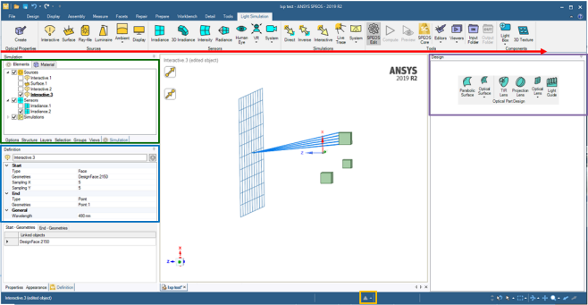 - Simulation panel (green section): All Speos features are stored here except Optical Part Design features.