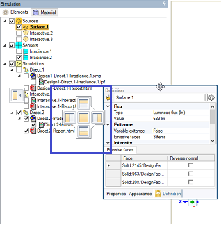 Tip: You can drag and drop Speos objects in and out of the folders created and to reorganise them inside a folder (except for Materials). - The Definition panel is dedicated to Speos features.