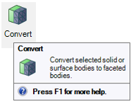 Note: With this option, you cannot visualize the Speos meshing as the meshing used for simulation is directly inherited from the geometry itself.Solid/surface body can be used if the first import option failed to work. This option allows you to import the mesh as a surface body. The surface body then must be converted into a closed faceted surface by using the Convert option.