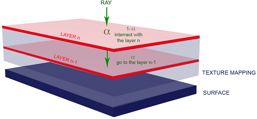 The probability to interact with the layer Ln or to go to the layer Ln-1 is calculated according to the level of α, for 0 < α < 255. There is α-in-255 chance that a ray uses the Layer Ln optical properties.