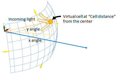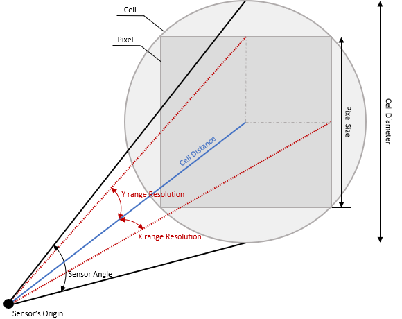 For each pixel of the Intensity Sensor corresponds a virtual cell located at a Cell distance drom the center of the sensor, with a size of Cell diameter.