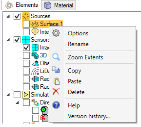 Note: Any source, sensor or simulation can be copied. When you create a feature's copy, you inherit from its definition.To delete a feature, make sure this feature has no dependencies with other features (a source selected in a simulation for example), otherwise the feature will not be deleted from the Tree.