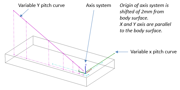 The Variable Pitch Mapping uses two curves sketched in the CAD environment (one along the X axis, one along the Y axis). These curves will be used to determine the distribution of the mapping along both axes.