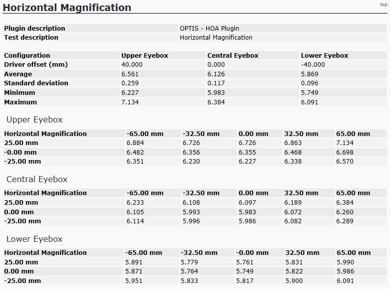 The result of the computation is displayed as a table that contains the Horizontal Magnification computed for each sample EBij of the binocular eyebox.