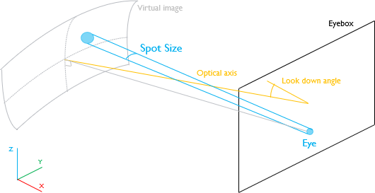 For each sample VIij of the virtual image, the Spot Size gives the mean, over the sample EBij of the binocular eyebox, of the diameter of the spot on the sample VIij of the virtual image seen by the sample EBij of the binocular eyebox.